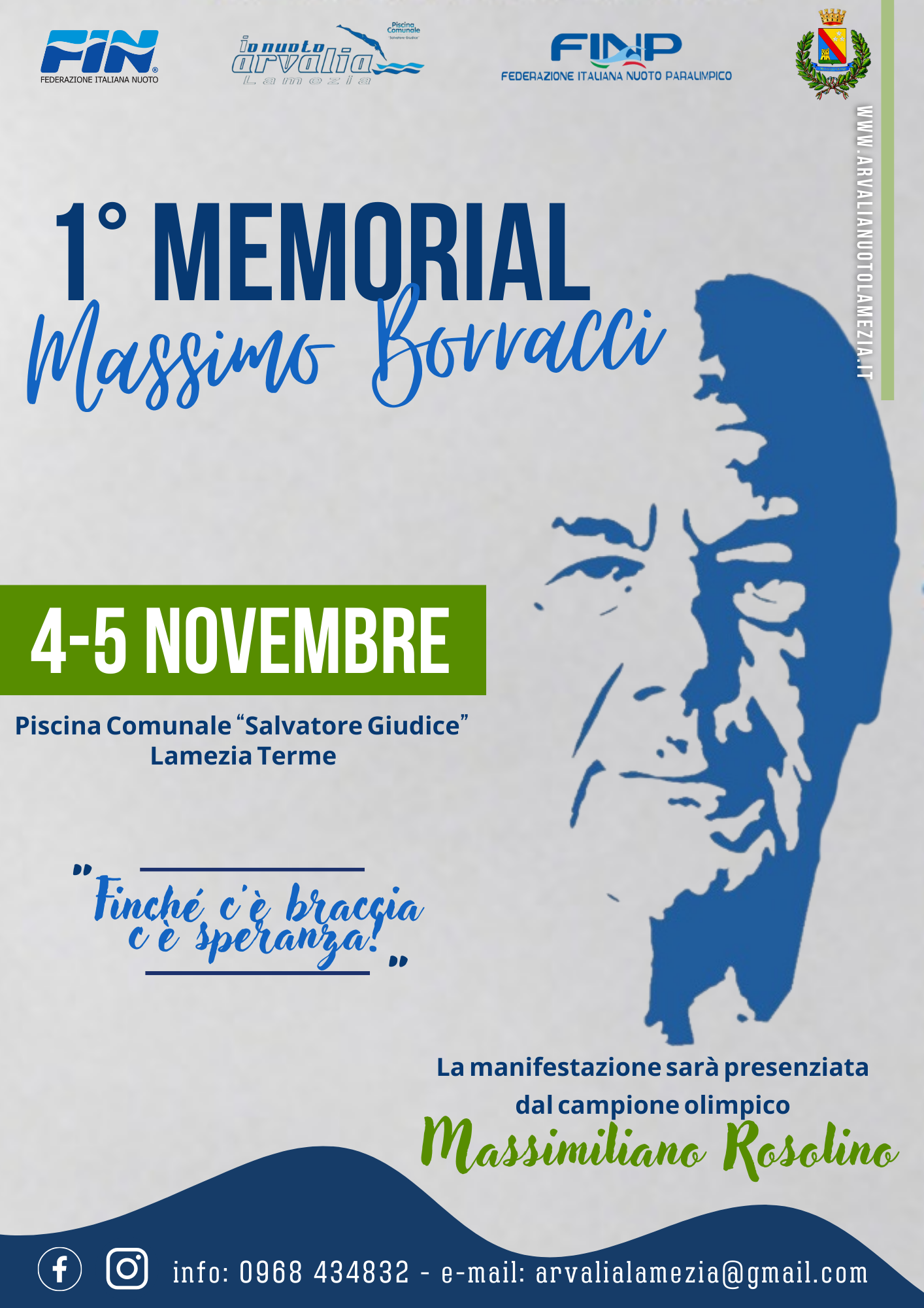 Così, proprio in occasione di quello che sarebbe stato il suo 79esimo compleanno, a un anno e mezzo dalla sua triste scomparsa, ha deciso di indire – in collaborazione con la FIN Calabria e con la FINP Calabria – il “1° Memorial Massimo Borracci”. La manifestazione avrà luogo il 4 e il 5 novembre 2023, ovviamente all’interno della piscina comunale di Lamezia, e sarà presenziata dal campione olimpico Massimiliano Rosolino, da sempre fortemente legato a mister Borracci.