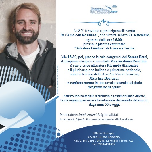 “Artigiani dello Sport”, un tuffo nel mondo del nuoto con Massimiliano Rosolino, Massimo Borracci e Riccardo Siniscalco 0 di Jessica Mastroianni Manca sempre meno al grande evento: vi aspettiamo! Navigazione articoli Articolo precedentePrecedente Conferenza stampa di presentazione dell’evento “In vasca con Rosolino”Articolo successivoAvanti Massimiliano Rosolino a Lamezia Terme: è grande festa per tutta la città!