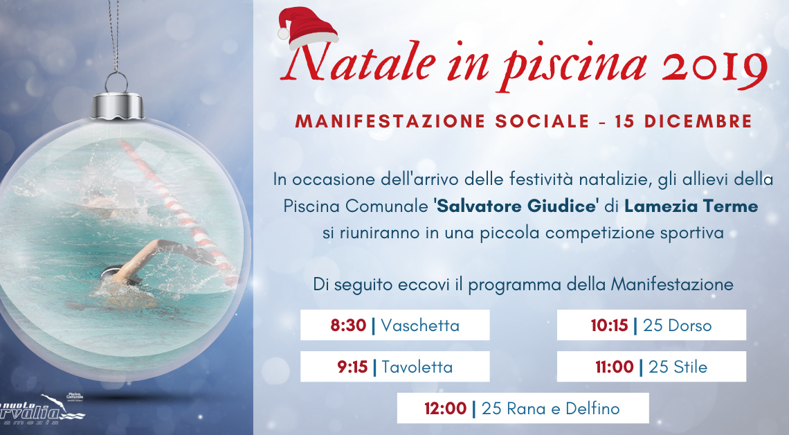 E’ prevista per domenica 15 dicembre, alle 8.45, la manifestazione sociale dal titolo “Natale in Piscina“, organizzata dalla Arvalia Nuoto Lamezia.